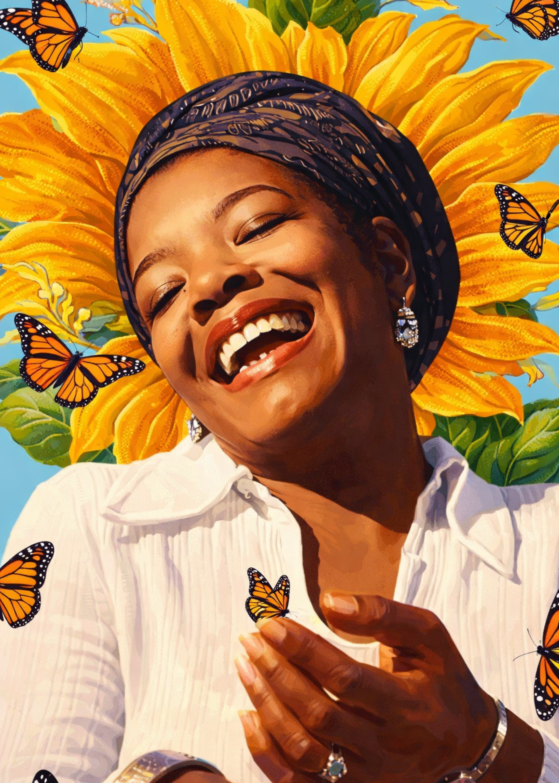 Celebrate strength, resilience, and unshakable confidence with Still I Rise Maya. This radiant design in our Whimsical Women Collection features a woman glowing with joy and power, framed by a bold sunflower in full bloom and surrounded by delicate monarch butterflies. Each element symbolizes growth, transformation, and the quiet strength to rise again, no matter what.