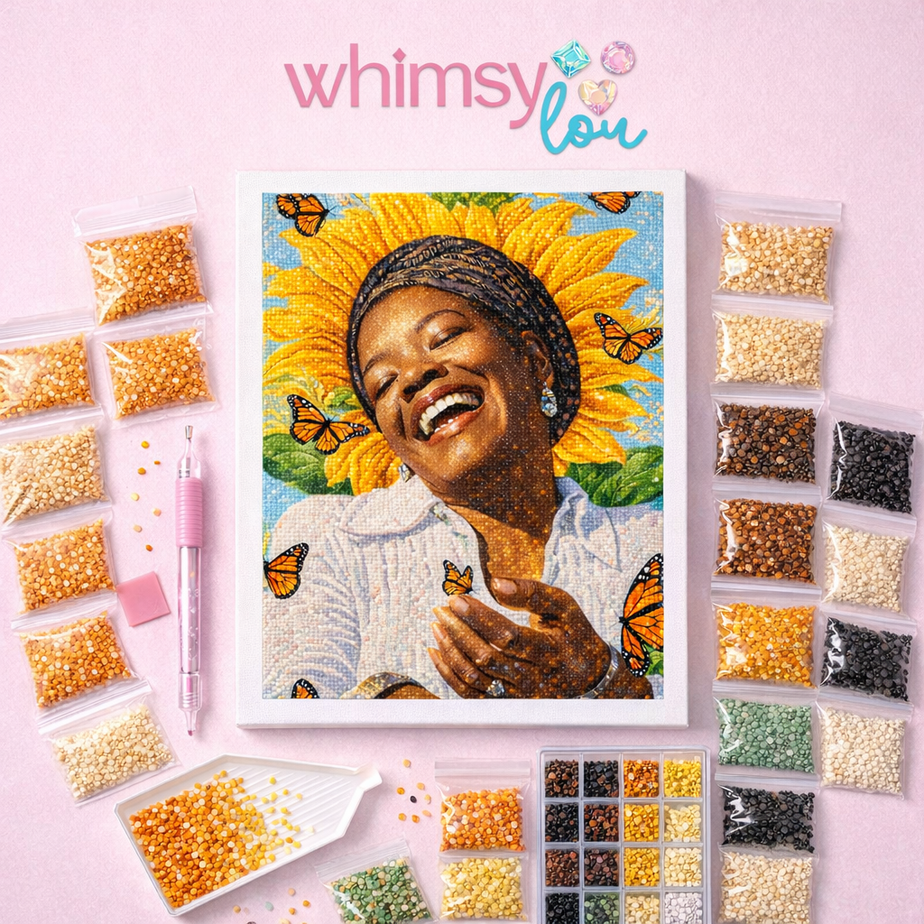 Please note: Product images are for display purposes only. Colors and styles of included tools (such as the diamond painting pen, tray, and accessories) may vary. Each kit will include all necessary materials to complete your diamond painting. Each design is uniquely created and refined by Whimsy Lou, using a blend of artistic vision and digital tools to bring every piece to life.